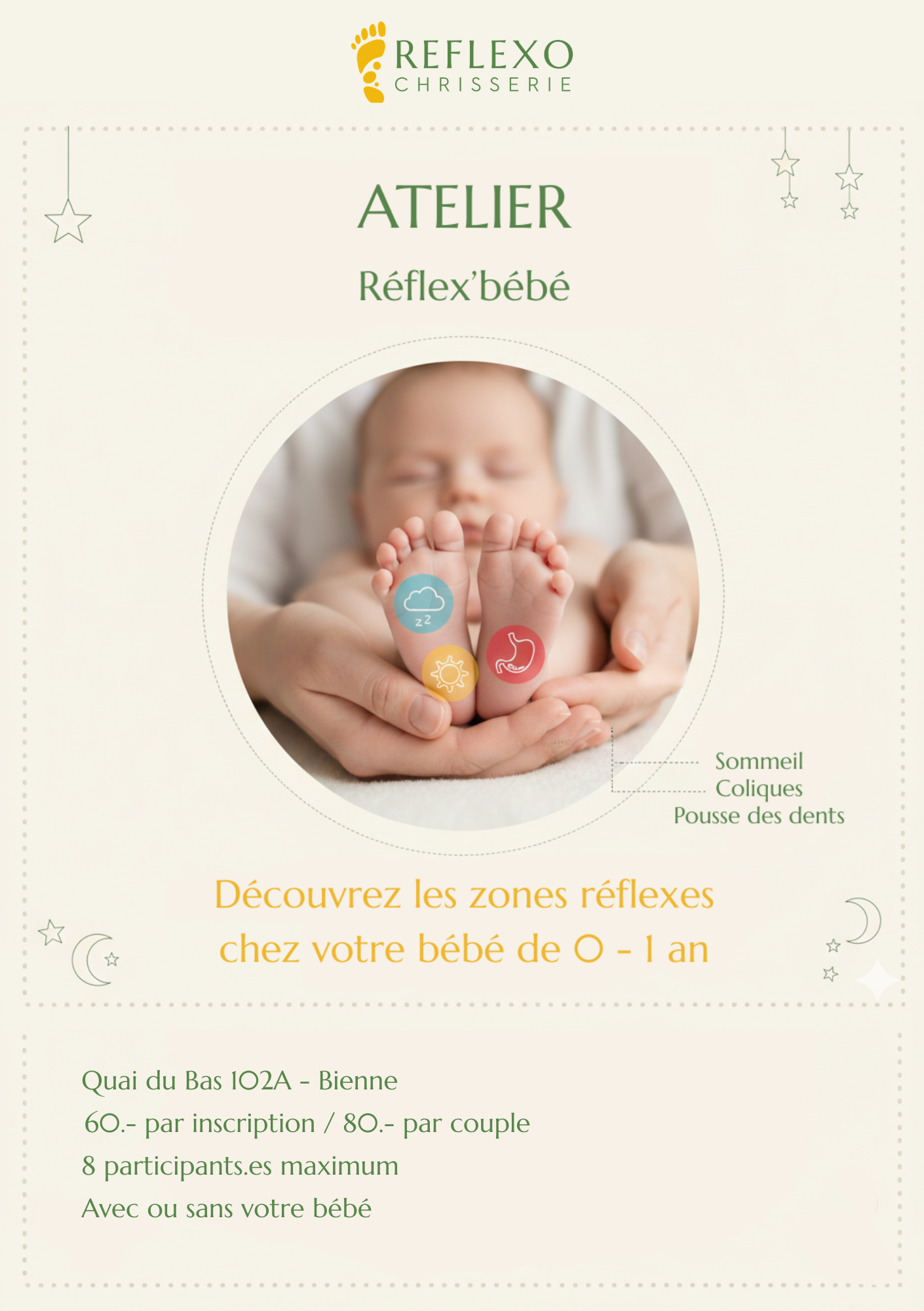 Lors de cet atelier pratique et bienveillant, je vous apprends à stimuler en douceur certaines zones réflexes du pied afin d’accompagner les troubles du sommeil, les coliques, les inconforts digestifs et les poussées dentaires. Vous découvrirez comment adapter votre toucher, observer les réactions de votre enfant et instaurer un rituel apaisant à la maison. En petit groupe, avec démonstration et pratique guidée, vous repartirez avec des outils concrets, de la confiance et un support récapitulatif pour continuer en toute sérénité.
